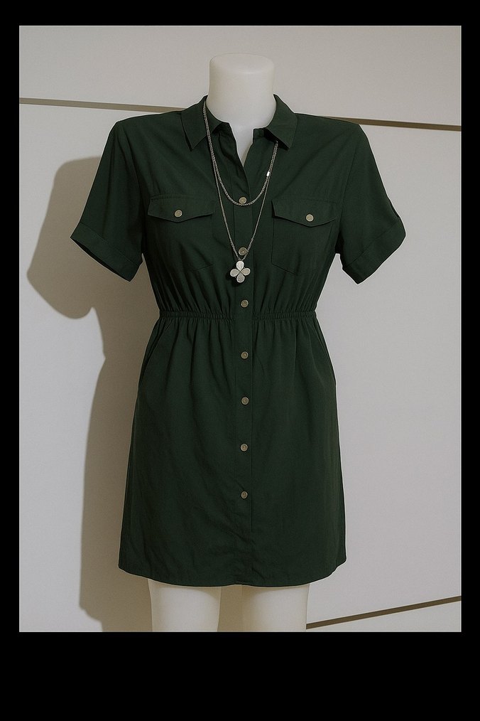 Haki yeşili midi boy, kısa kollu, yakalı keten elbise. Kemerli bel ve düğmeli ön kısım detayları bulunur. Rahat ve salaş kesim, günlük kullanıma uygundur. Elbise boy 88 cm. Son fiyat