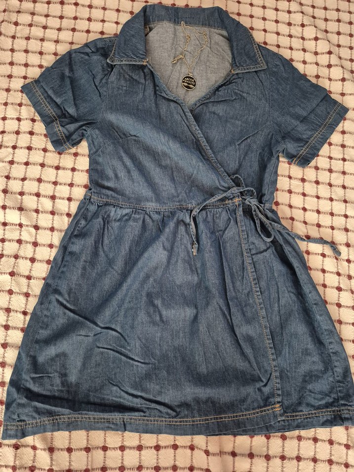 Mavi kot kumaştan, kemerli, kısa kollu ve yakalı midi elbise. Bol kesimi ve rahat stiliyle günlük kullanıma uygun bohem tarzı sunar.