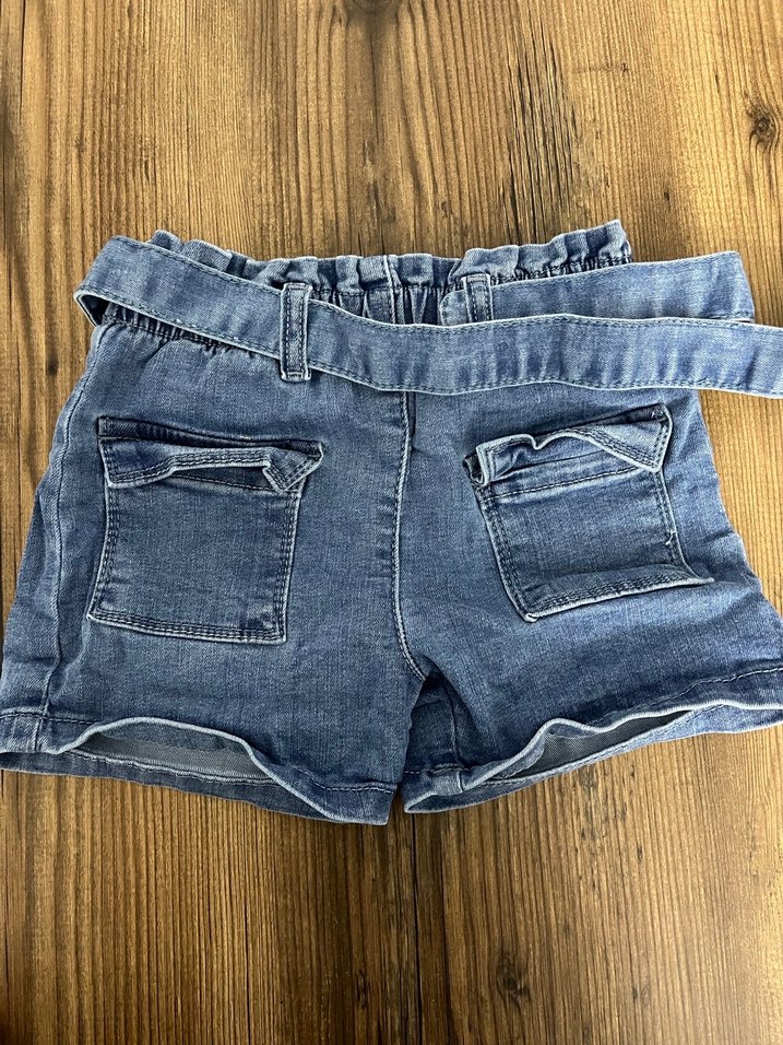 Gri tonlu, kemerli ve arka cepli, kızlar için fitted kesim mavi denim şort. Rahat sokak stili için uygundur. 18-24 etiketli fakat 2/3 yaşa olur
