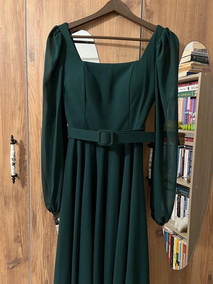 Kemerli, tek renk koyu yeşil uzun elbise, ince kesim ve kayık yaka. Uzun kolları şeffaf ve askılıdır. Modern klasik vintage tarzda, ofis için uygundur.