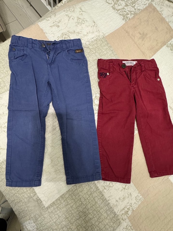 Koyu kırmızı kot kumaştan, kemerli ve regular fit erkek pantolon. Sokak stili için uygun.