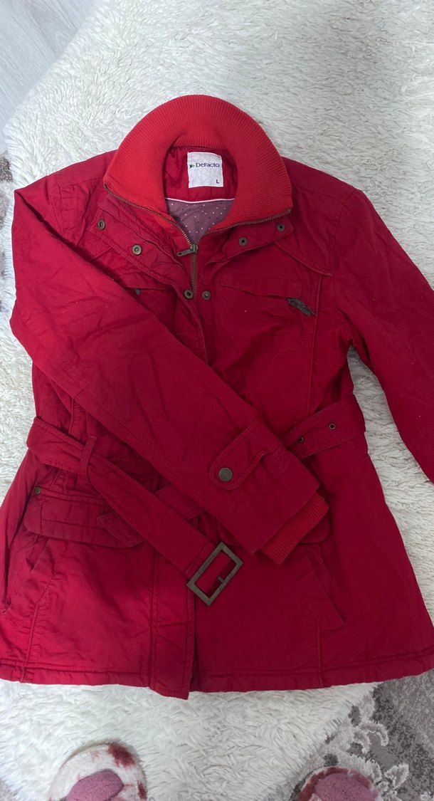 Koyu kırmızı, kemerli, belden oturan, diz hizasında uzun kollu kışlık ceket. Notched lapel yaka ve yumuşak, sıcak kumaştan üretilmiştir. ❄️