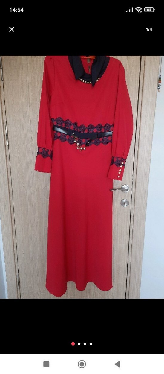 Koyu kırmızı renkli, uzun kollu ve yüksek yakalı bu elbise nakış detaylarına sahiptir. Kemerli ve klasik kesimdir, romantik akşamlar için uygundur.