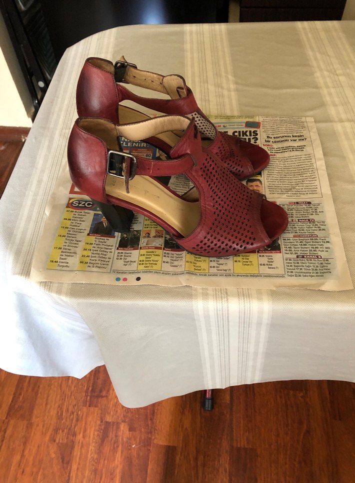 Kemerli Koyu Kırmızı Vintage Blok Topuklu Sandalet