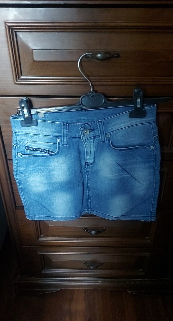 Kemer detaylı, dar kesim koyu mavi denim mini etek, günlük sokak stiline uygun.