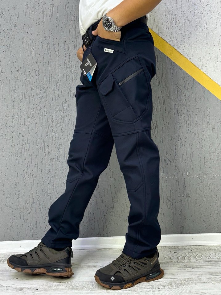 Koyu mavi renkli, kemerli ve normal kalıp erkek pantolon. Yumuşak ve sıcak dokulu polarlı kumaştan, midi boyda, kamuflaj desenli ve sokak stiline uygun.