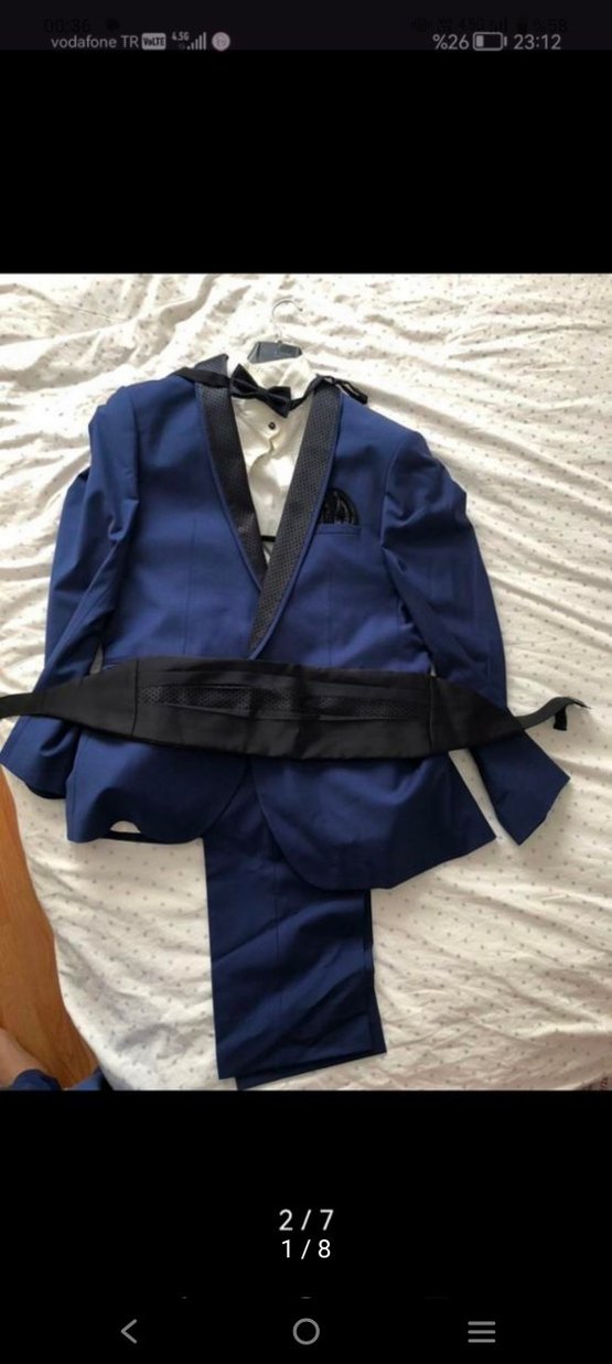 Koyu mavi renkte, kemerli ve kesik yaka detaylı erkek takım elbisesi. Düzenli kesim, askılı kollu ve midi boy, iş ve düğünlere uygun.