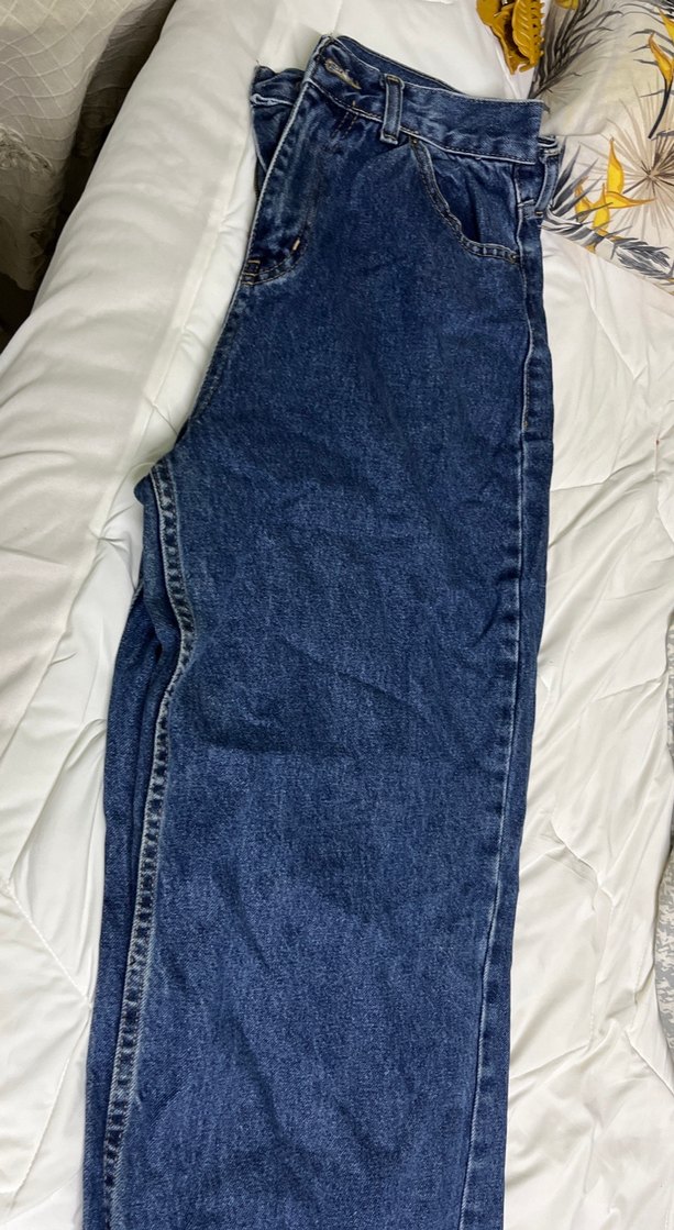 Koyu mavi, kemerli, midi boy, düz desenli kadın denim pantolon. Rahat kesimi ve günlük sokak stili için uygun.