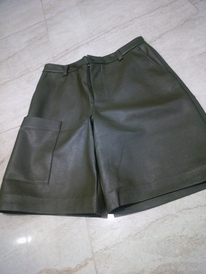 Koyu yeşil renkte, kemerli bel ve bol kesime sahip deri kadın şort. Minimalist sokak tarzı için büyük yan cebi bulunur. Günlük kullanım için uygundur.