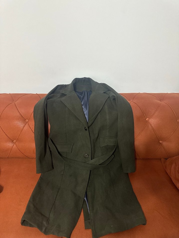 Kemerli yeşil kaban, uzun kollu ve klasik yakalıdır. Önünde iki cep ve düğmeli kapama bulunur, içi astarlıdır. Omuzdan uzunluğu 120 cm