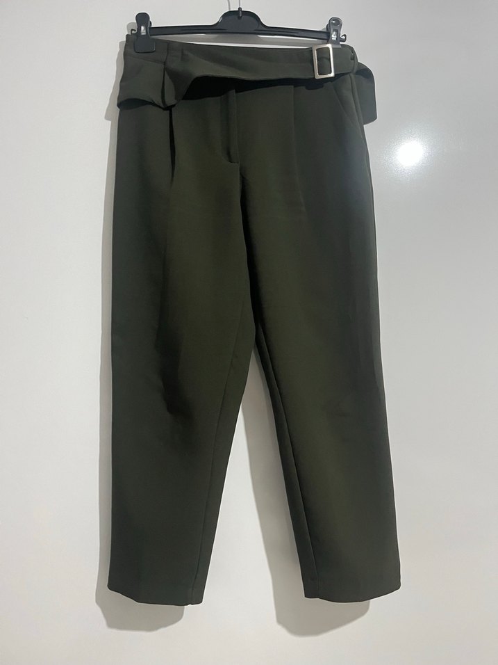 Kemerli, regular fit ve midi boy koyu yeşil kadın kumaş pantolon. Ofis ve şık günlük kullanıma uygun, yumuşak sentetik kumaştan yapılmıştır.