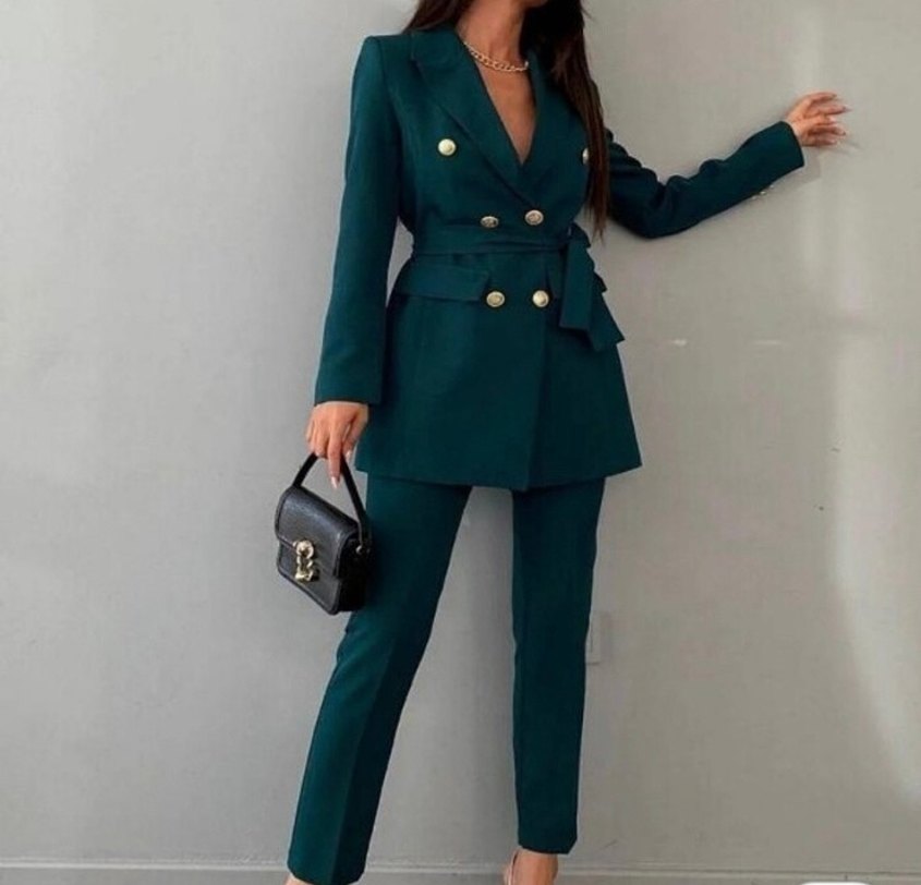 Koyu yeşil renkte, kemerli ve uzun ceketli, kesik yakalı kadın takım elbisesi. Sentetik kumaştan, klasik ve şık ofis tarzı. Hiç giyilmedi.