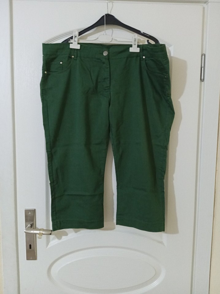 Koyu yeşil renkte, keten kumaştan, kemerli ve bol kesim mini kadın pantolonu. Günlük kullanıma uygun rahat bir model.