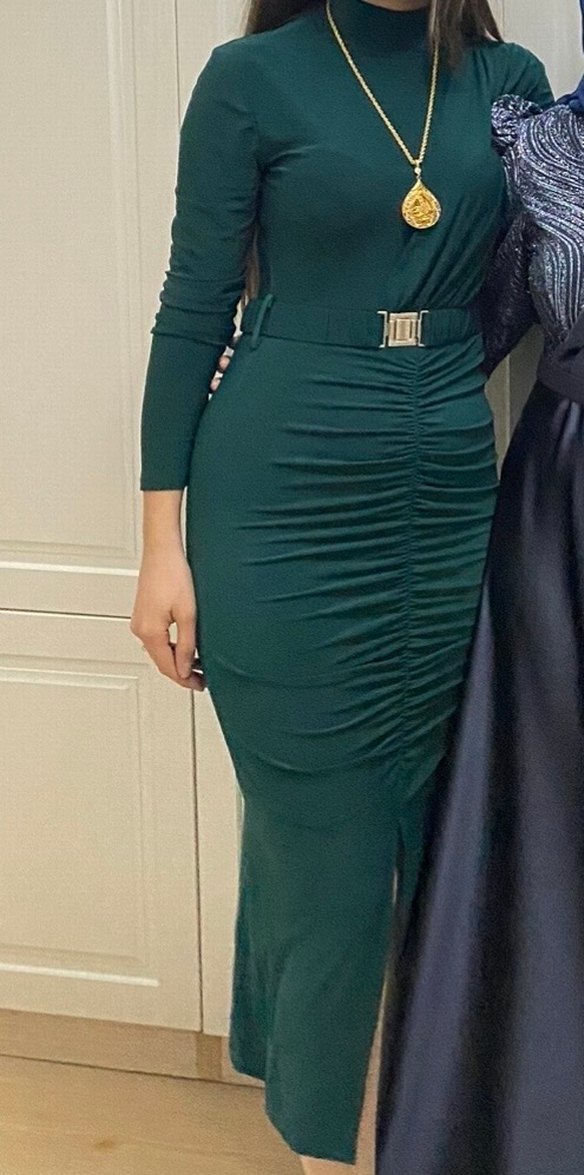 Kemerli, yüksek yakalı ve askılı kollu, modern klasik tarzda, koyu yeşil uzun ve vücuda oturan elbisedir. Ofis için uygundur. Bir kere nişan için giyilmiştir