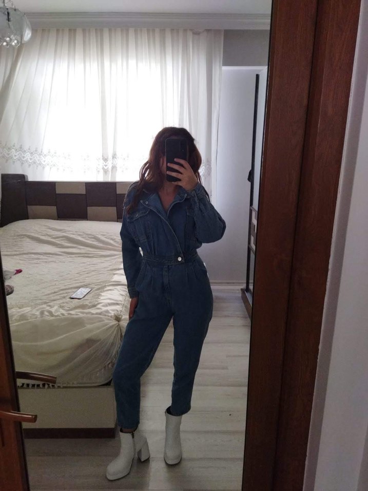 Lacivert denim kumaştan, uzun kollu, yüksek yakalı ve kemerli kadın tulumu. Midi boy ve bol kesimiyle gündelik kullanıma uygundur.