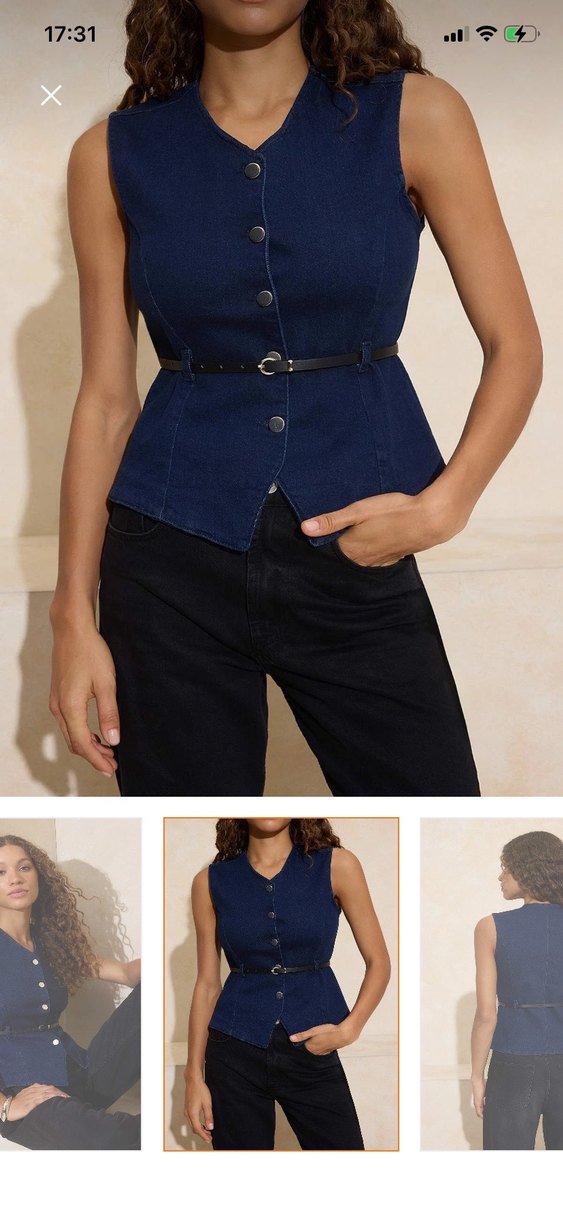 Kemerli, lacivert renkli, kolsuz denim kadın yelek. Notlu yaka ve midi boyda, günlük kullanım için uygun.