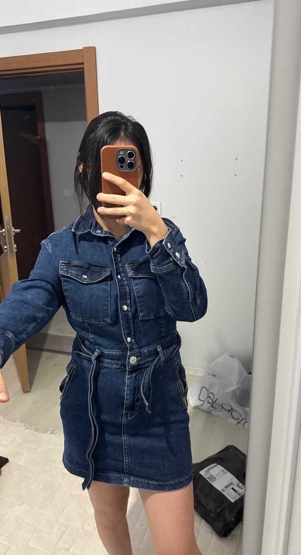 Kemerli bel, uzun kollu ve yakalı, lacivert renkli, dar kesim mini denim elbisedir. Hiç bir sorunu yok