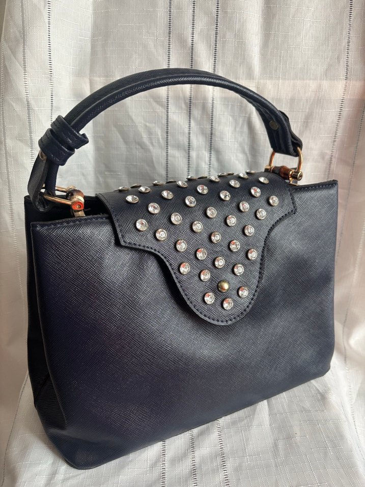 Kemerli kapak ve gümüş çivilerle süslenmiş lacivert deri kadın çantası, gotik esintili Paris tarzını yansıtıyor.