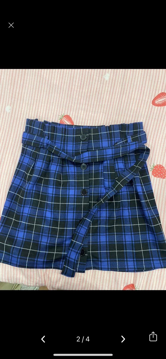 Kemerli, düğmeli ve lacivert ekose desenli mini etek. Sentetik kumaştan, bol kesim ve günlük sokak stili için uygun.