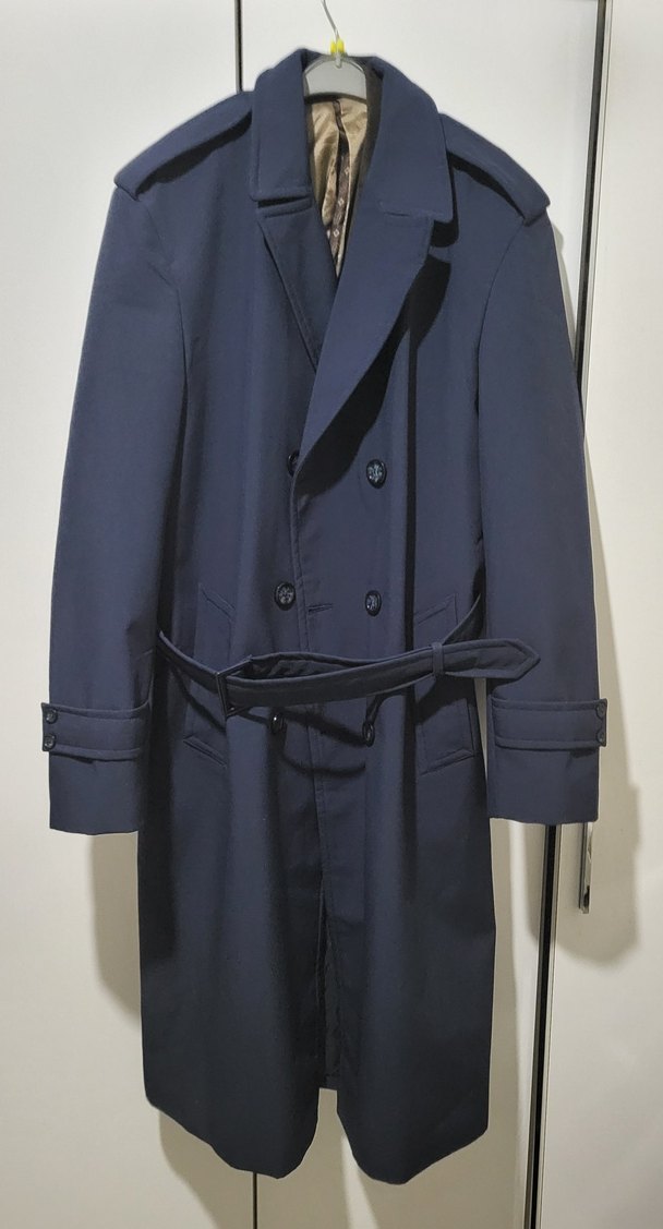 Lacivert renkli erkek uzun palto, kemerli ve klasik kesimlidir. Notch yaka ve askılı kollarıyla ofis ve sokak stiline uygundur. Sentetik kumaştan üretilmiştir.