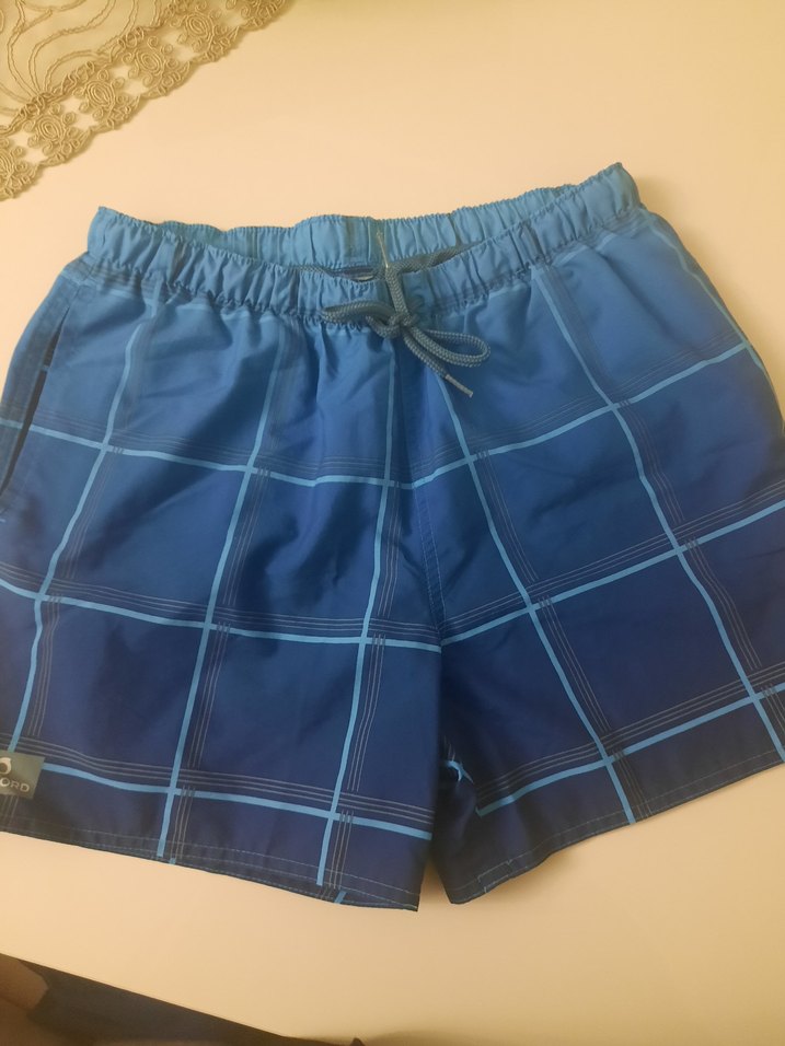 Lacivert tonlarında, kemerli ve bol kesim erkek mini şort. Minimal kare desenli, kısa boylu, plaj ve sokak stiline uygun. Etiketini oğlum kesmiş.