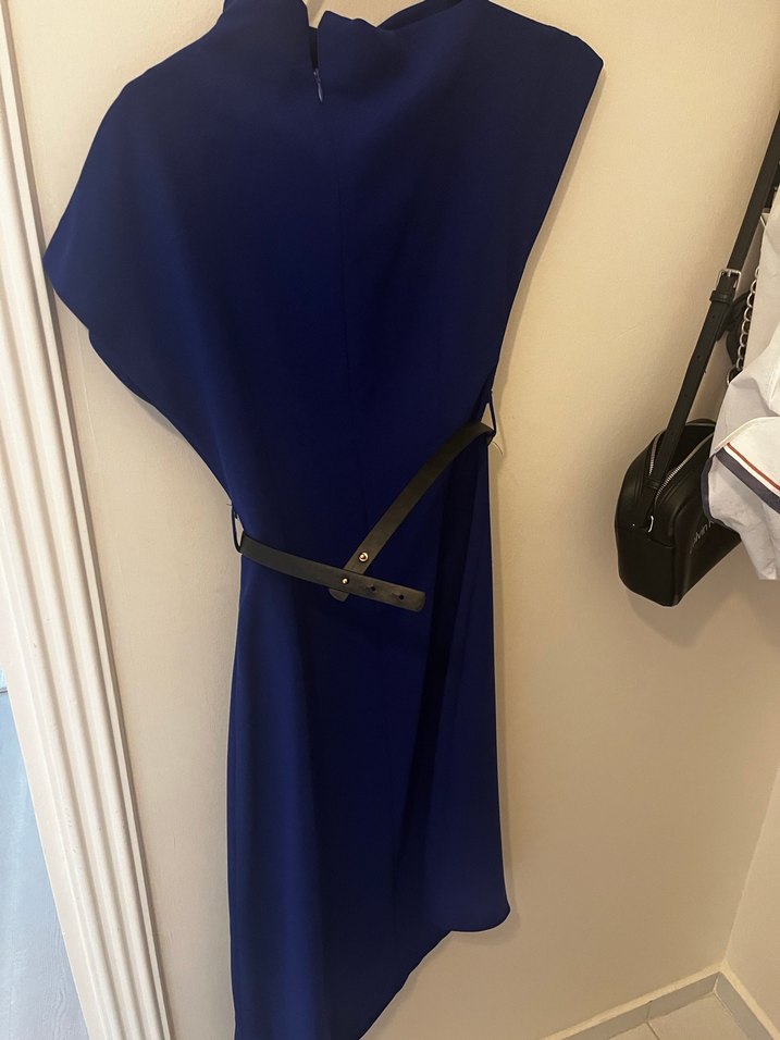 Kemerli, lacivert, halter yaka ve ince askılı bu midi boy elbise, modern ve avangart tarz sunar. Günlük kullanıma uygun, sade ve şık bir tasarıma sahiptir.
