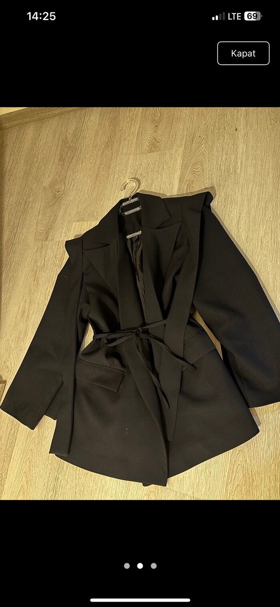 Kemerli, lacivert kadın blazer ceket. Notlu yaka ve askılı kolları vardır. Ofis veya sokak stiline uygun, düz dokulu sentetik kumaştan yapılmıştır.