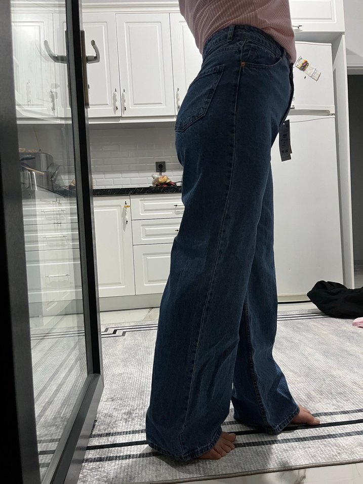 Lacivert renkli, kemerli ve bol kesim midi uzunlukta kadın kot pantolon. Günlük kullanım için rahat ve desen içermeyen bir tasarıma sahip.