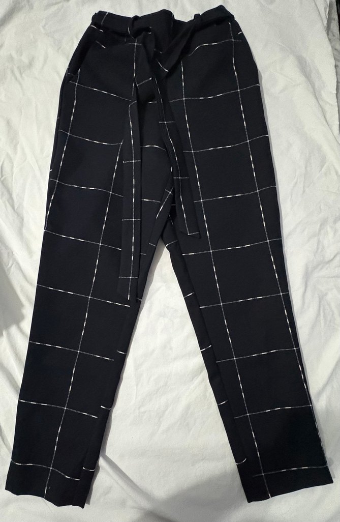 Kemerli bel, midi boy ve hafif kareli desene sahip lacivert kadın kumaş pantolon. Günlük ve iş stiline uygun rahat kesim.