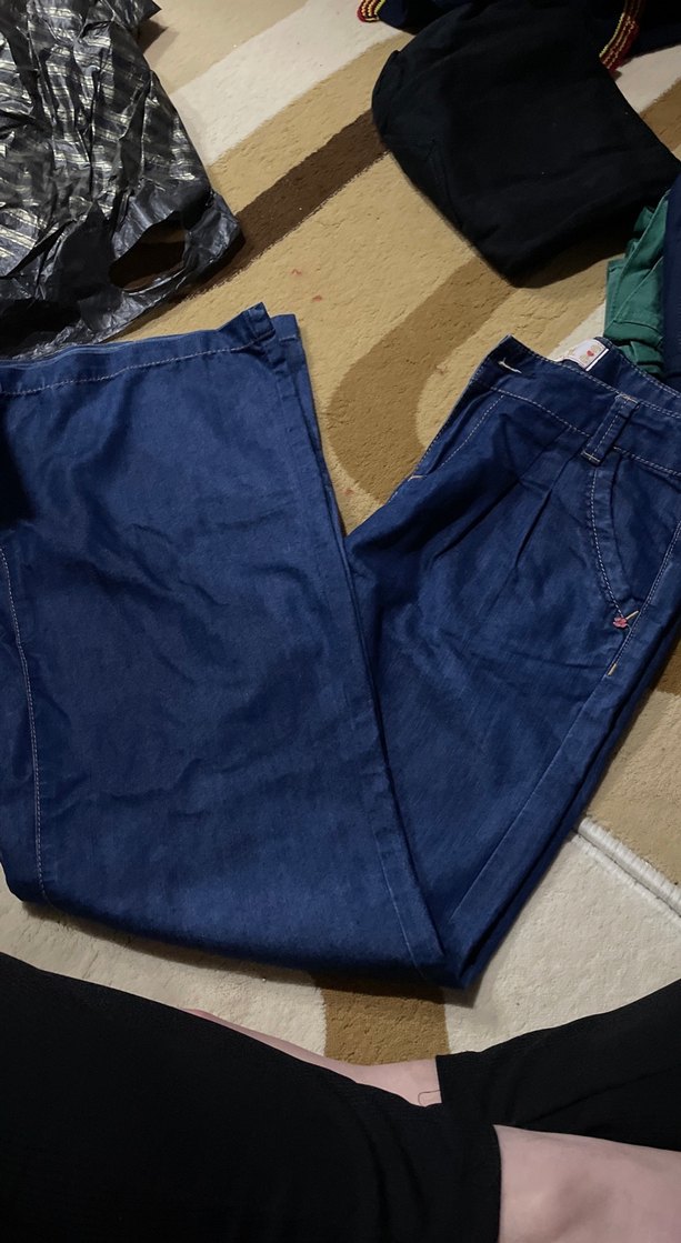 Lacivert renkte, kemerli, bol kesim midi boy kadın jean. Günlük kullanım için uygun, rahat ve sokak stili görünümlü.