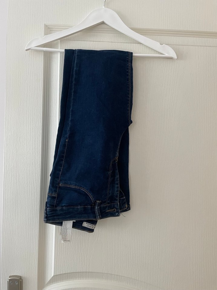 Kemerli, lacivert midi uzunlukta, dar kesim kot pantolon. Minimalist ve günlük sokak stili için uygundur.