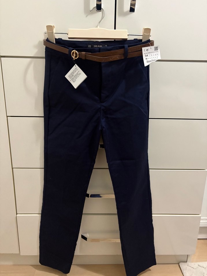 Kahverengi kemerli lacivert pantolon, normal boy ve regular fit. Ofis ve günlük stil için uygundur.