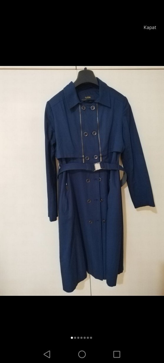 Uzun, kemerli lacivert kadın trençkot, keskin yakalı ve uzun kollu. Düzenli kesimi ve desensiz tasarımıyla şık ve rahat bir seçim. ️