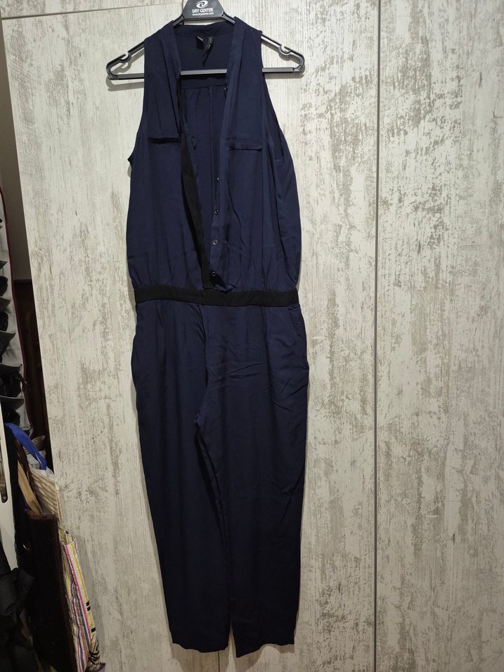 Kemerli, yakalı ve kolsuz lacivert uzun tulum. Viskon kumaştan, minimal ve sokak tarzı, dış mekan kullanımı için uygun.