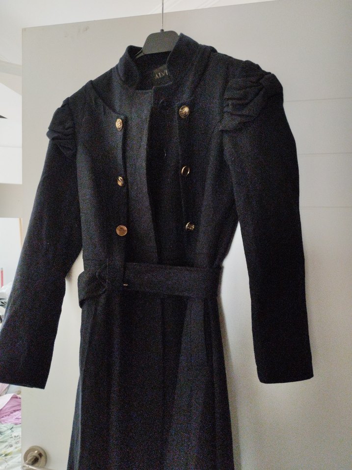 Kemerli,kaşe Alvina marka kabarık omuzlu ve altın düğmeli siyah kadın kabanı. Yüksek yakalı ve uzun kolludur.