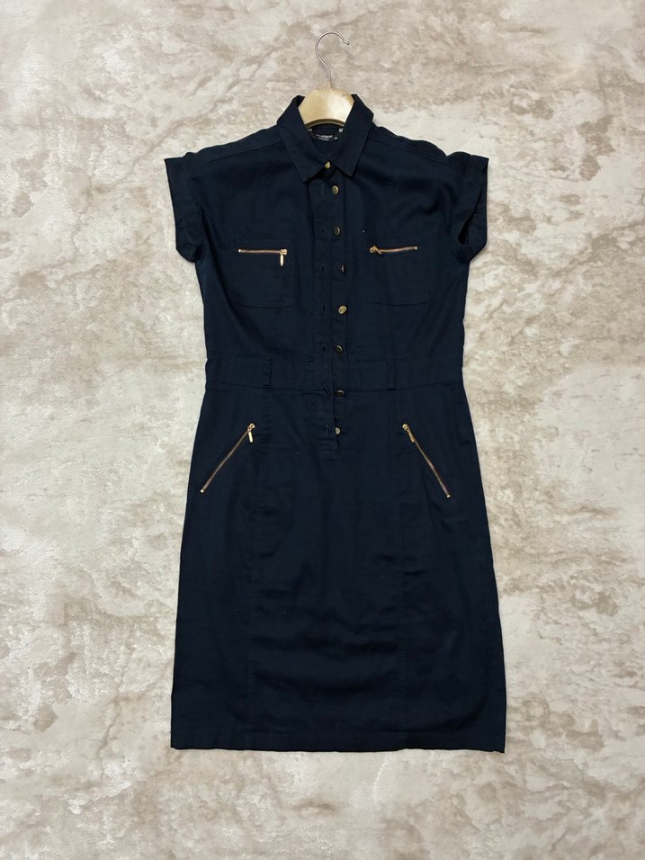 Lacivert, kemerli, kısa kollu, yakalı, fermuarlı cepli, fitted denim elbise. Günlük ve ofis kullanımı için uygundur.