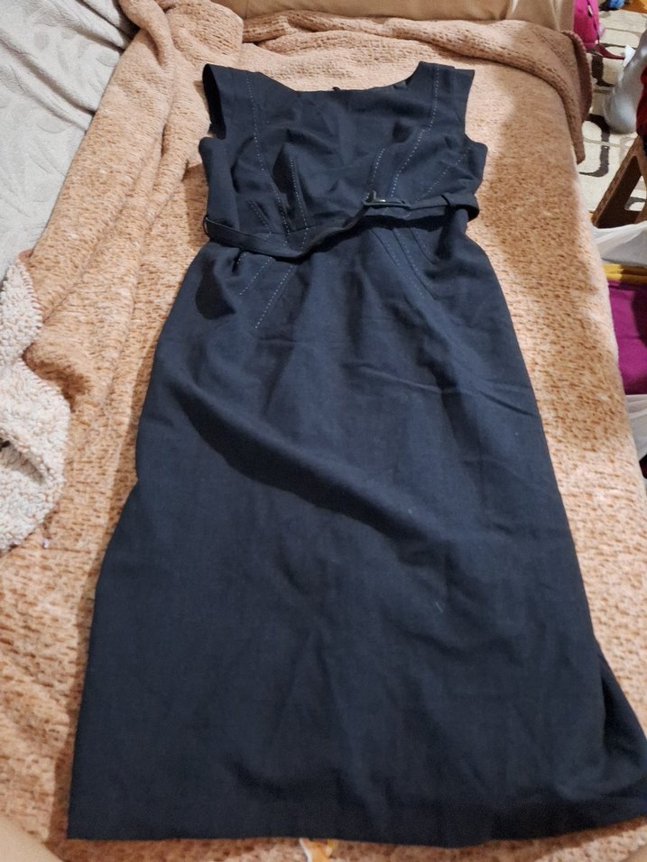 Keten kumaştan, kemerli ve kolsuz, straplez kesim lacivert uzun elbise. Düz ve sade tasarımıyla ofis kullanımı için uygundur.