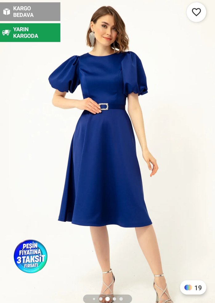 Kemerli lacivert midi elbise, kısa balon kollu ve tekne yakalıdır. Parlak dokusu ve regular kesimiyle ofis için uygundur. Sentetik kumaştan üretilmiştir. ✨