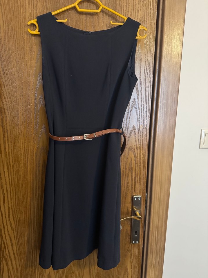 Kemerli, lacivert , kolsuz midi elbise, vücuda oturan kesime sahip. Minimalist tarzda, günlük kullanım için uygun.