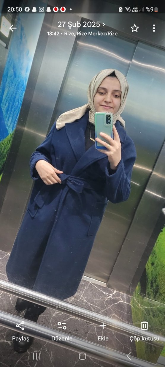 Kemerli beli, notched yaka ve uzun kollu, koyu lacivert renkte yumuşak ve sıcak kumaştan yapılmış kadın midi kaban. bir kaç kez giyildi