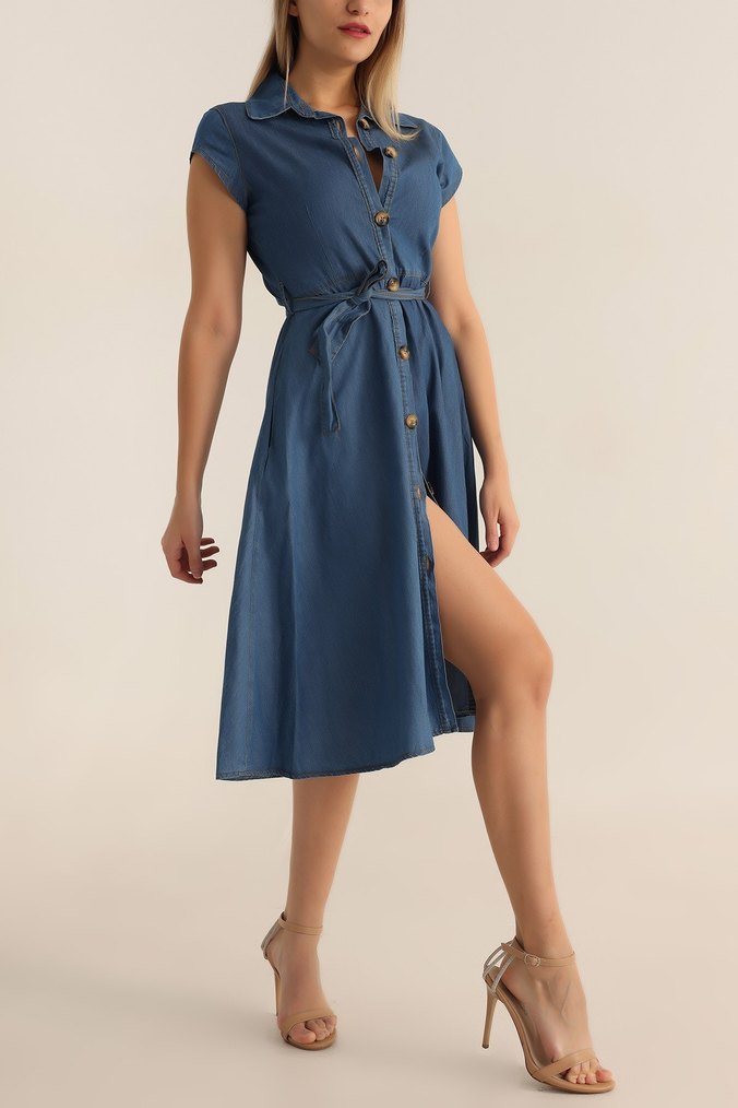 Açık lacivert renkte, kısa kollu ve V yakalı bol kesim midi kot elbise. Kemerli ve düğmeli ön detayıyla günlük sokak stiline uygun.