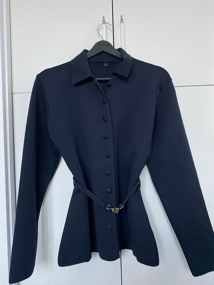 Kemerli, uzun kollu, notched lapel detaylı lacivert kadın ceket. Normal boy midi kesim, iş ve sokak stilini birleştirir. Sentetik kumaştan üretilmiştir 1 defa kullanıldı✨