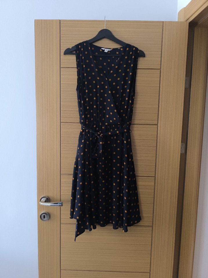 Kemerli,puantiyeli, V yakalı ve kolsuz midi elbise. Düzgün sentetik kumaştan üretilmiştir, gündelik kullanıma uygundur.