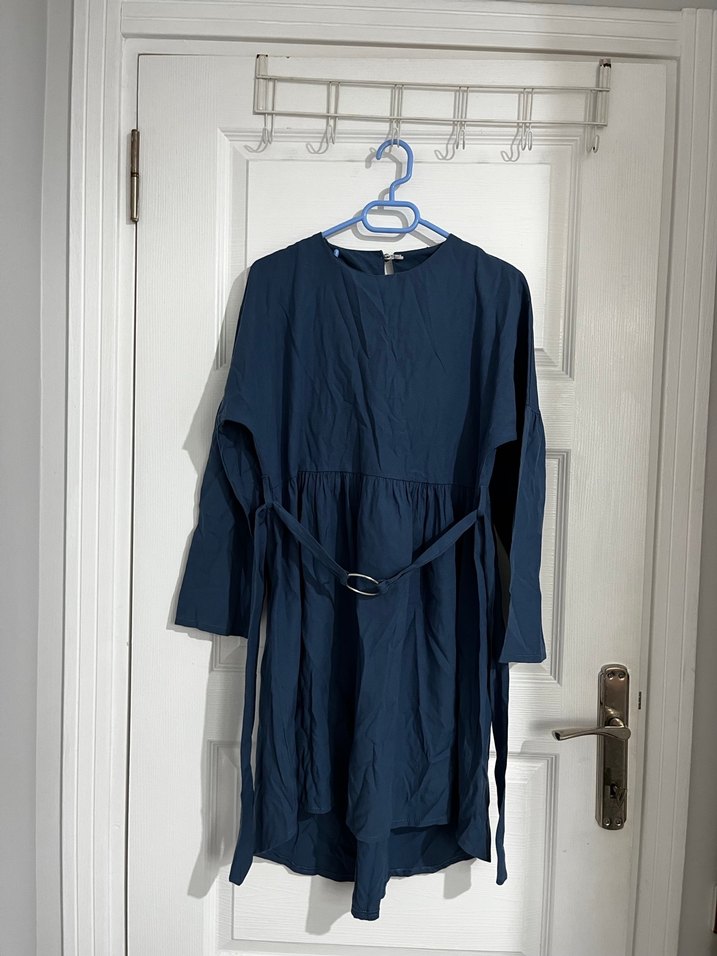 Koyu mavi tunik, kemerli bel ve yuvarlak yaka ile bol kesimdir. Hiç giyilmedi tesettür için uygundur