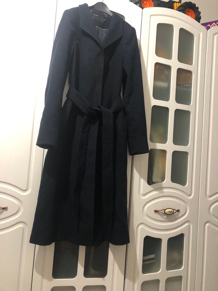 Kemerli ve klasik yakalı, yumuşak ve sıcak kumaştan yapılmış uzun lacivert kaban.