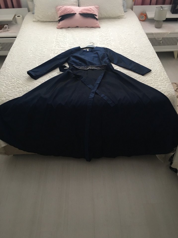 Bu uzun lacivert elbise, kemerli beli ve kesik yaka detayına sahiptir. Uzun kollu ve bol kesim olup gotik tarzı yansıtır, düğünler için uygundur.