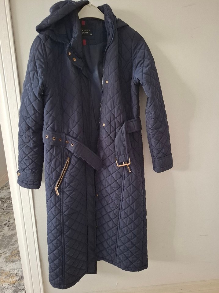 38 beden lacivert kapitone kaban kapüşonlu temiz az kullanıldı.uzunluğu 110 cm