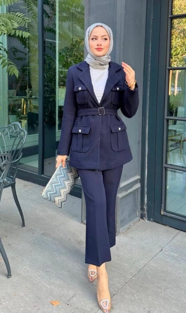 Kemerli, yakalı ve askılı kollu lacivert uzun ceket ile regular fit pantolondan oluşan kadın takımı. Sentetik kumaştan ürün hiç giyilmedi