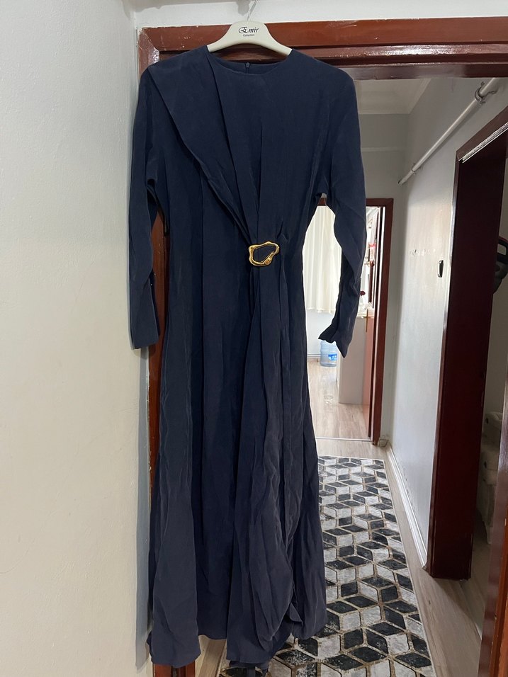 Lacivert uzun keten elbise, kemerli ve uzun kollu, modest ve regular fit, yakası notched lapel, ofis için uygun.