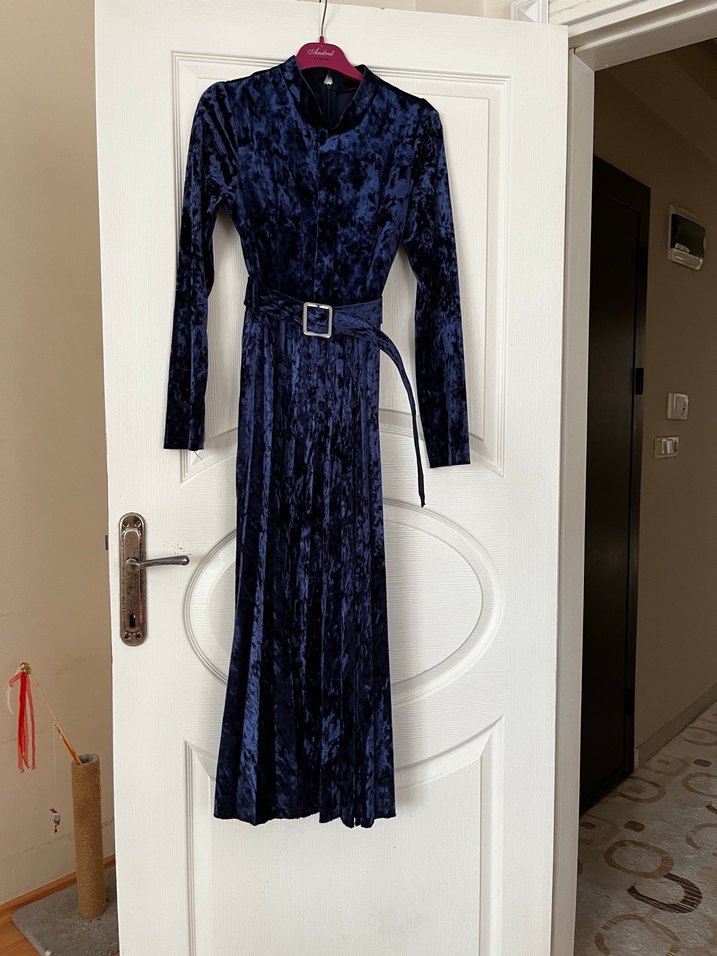 Kemerli ve uzun kollu, koyu mavi renkte uzun elbise. Yaka kısmında kesik detay ve hafif batik desen bulunur. Bir kez giyildi 36-38 beden aralığı esnekltir